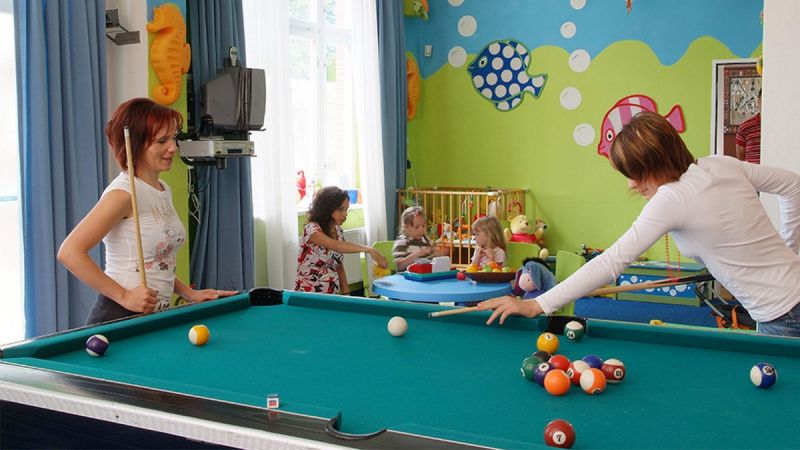 ♦ Ausstattung: Bar mit Lounge, große Küche zum gemeinsamen Kochen, Spielzimmer, Billardraum, Dusche, WC, Garten/Terrasse, Gruppenraum, Bettwäsche, Handtücher